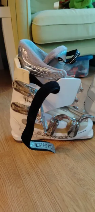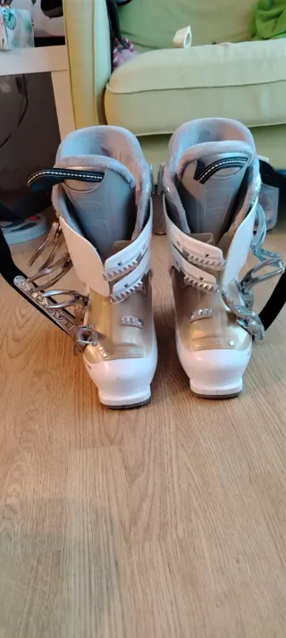 Botas de esquí con un diseño moderno y elegante, perfectas para disfrutar de la nieve. Solo se han llevado 1 vez. Tallas 24,5 - Color blanco y dorado. - Hebillas ajustables para un ajuste seguro. - Interior forrado para mayor comodidad.