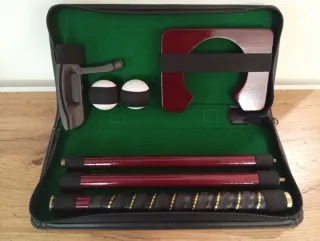 Maletín de golf con todo lo necesario para practicar. Excelente calidad con putter desmontable, ideal para regalar. Ideal para jugar con amigos en interiores o exteriores. Valor 125€ - Incluye dos bolas de golf. - Incluye un putter. - Incluye un accesorio de madera para alinear golpes. - Maletín negro con interior verde.