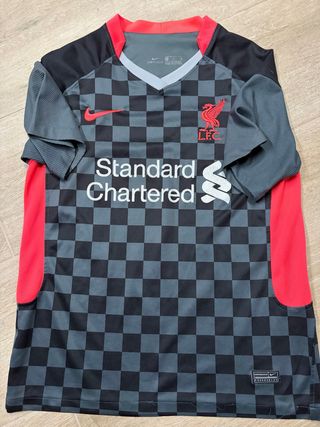 Camiseta oficial del Liverpool Football Club, modelo de la temporada 2020-2021. - Diseño a cuadros en gris y negro. - Detalles en rojo y negro. - Logo de Nike y escudo del club bordados. - Patrocinador principal: Standard Chartered.