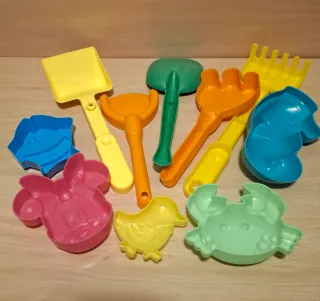 Conjunto de juguetes para la playa o el arenero. Precio de 2 eur por todo el lote. - Incluye moldes de animales marinos y personajes. - Set de palas y rastrillos de colores. - Ideal para juegos al aire libre.