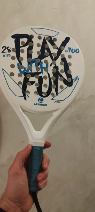 Pala de pádel Artengo para iniciación. - Modelo: PR 700. - Diseño: Play with fun. - Tamaño: 28 mm. - Color: Blanco y azul. En las fotos puedes ver los roces que tiene.