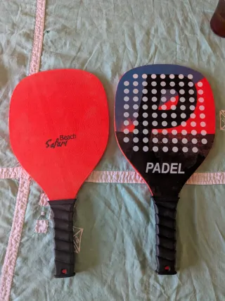 Set de dos palas de playa para jugar al pádel. - Pala de color rojo con diseño Beach Safari. - Pala de color negro y azul con diseño Padel y puntos blancos.