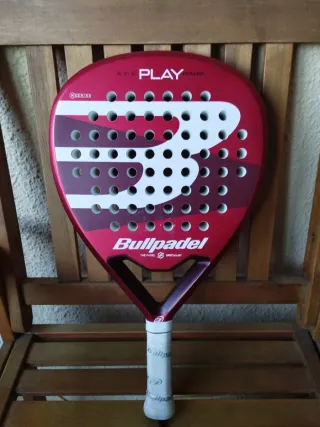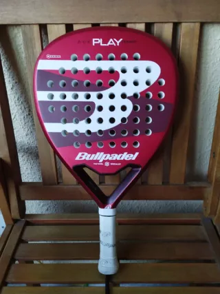 Pala de pádel Bullpadel modelo Play Power. - Pala de pádel de color rojo y blanco. - Diseño con agujeros característicos. - Marca Bullpadel visible en la pala y el grip.