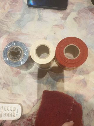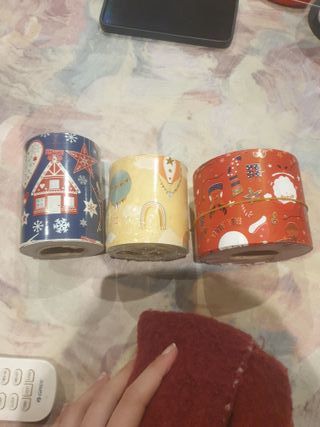Tres rollos de cinta de papel con motivos navideños. - Diseño de casita y estrellas sobre fondo azul. - Diseño de globos aerostáticos y arcoíris sobre fondo amarillo. - Diseño de adornos navideños y Papá Noel sobre fondo rojo.