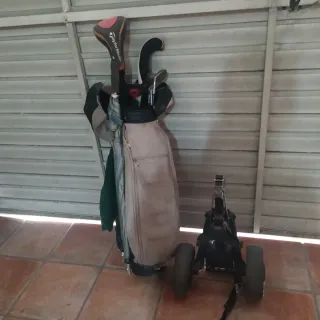 Se vende conjunto de golf completo. - Bolsa de golf de color beige. - Incluye varios palos de golf. - Carro de golf plegable.