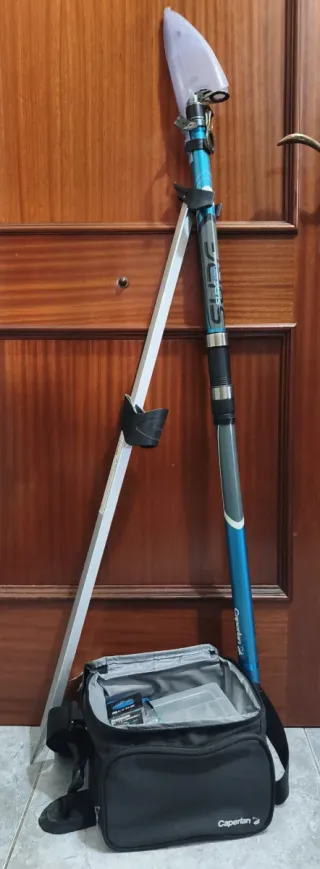 Caña y anzuelos entre otros accesorios. Sin carrete.