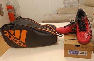 Zapatillas de pádel rojas Mizuno talla 42.5 con 4 partidos de uso (70 euros por separado) + paletero Adidas (20 euros por separado)