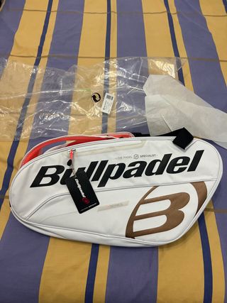 Paletero de la marca Bullpadel. - Diseño en color blanco con detalles en dorado y naranja. Nuevo a estrenar
