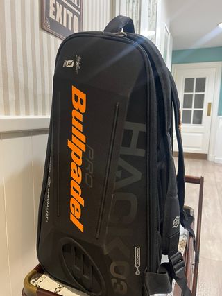 Paletero Bullpadel modelo Hack 03 en color negro con detalles en naranja. Diseño moderno y espacioso. Usado pero bien cuidado, está como nuevo. - Compartimento principal grande y espacioso para meter comida, ropa y más. - Bolsillos térmicos con capacidad de 2 palas cada uno. - Bolsillo con ventilación para zapatillas en la parte de abajo. - Tiradores acolchados.