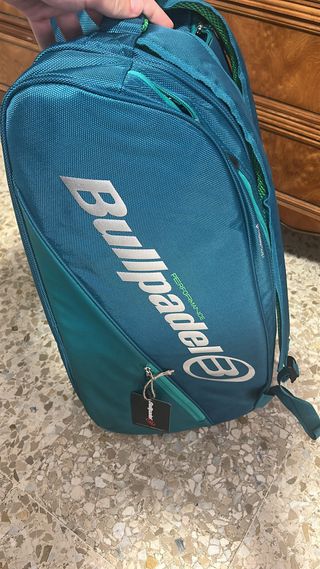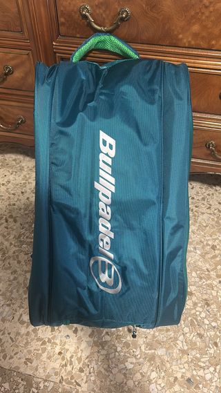 Paletero de pádel de la marca Bullpadel en color azul y verde. - Diseño moderno y funcional. - Compartimentos amplios para palas y accesorios. - Asas acolchadas para mayor comodidad.