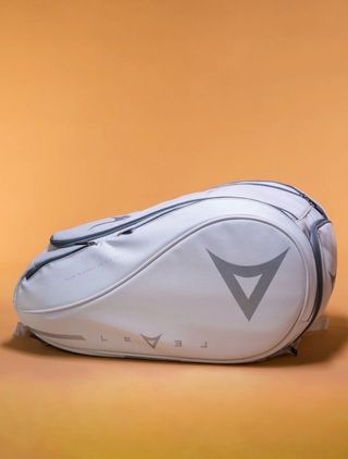 Paletero de la marca LEVEL PADEL, modelo Ice, nuevo. - Diseño moderno y espacioso. - Color blanco con detalles plateados. - Logo de la marca visible.