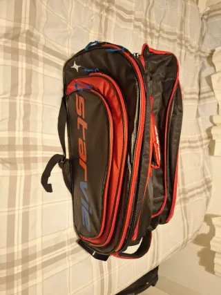 Paletero de pádel de la marca Star Vie, con un diseño moderno en negro y detalles rojos. - Compartimentos amplios para palas y accesorios. - Cierres de cremallera. - Correas ajustables para llevarlo cómodamente.