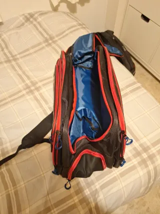 Vendo paletero Puma prácticamente nuevo. Ideal para guardar tus palas y accesorios de pádel. - Diseño elegante en negro y rojo. - Espacioso y con varios compartimentos. - Cremalleras resistentes y en perfecto estado. - Asa de mano y correas para llevarlo al hombro.