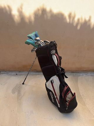 Kit de golf formado por bolsa y 14 palos. - Marca: Mizuno. - Color: Negro con detalles en rosa y blanco. - Patas para mantenerse en pie. - Compartimentos amplios para palos y accesorios. - Asa superior para el transporte. El Kit completo son 100 €. Se vende también cada pieza por separado: 20 € la bolsa y 10 € cada palo.