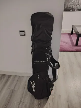 Bolsa de golf Titleist en color negro de piel con detalles blancos. Perfecta para transportar tus palos y accesorios. Se vende con los palos. - Diseño moderno y funcional. - Correa ajustable para mayor comodidad. - Amplios compartimentos para almacenamiento.