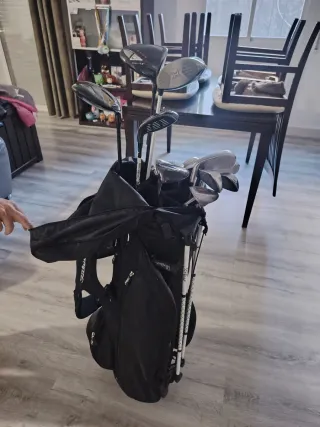 Conjunto de palos de golf y bolsa de transporte. - Incluye varios palos de diferentes números. - Bolsa de golf con soporte. - Diseño moderno y funcional.