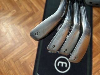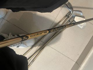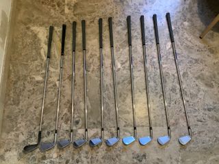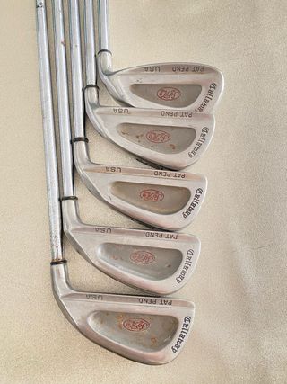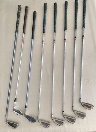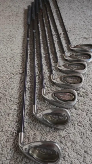 palos, hierros de golf Callaway S2H2, fabricados a principios de la década de 1990. Tienen un diseño de cavidad trasera (cavity back) que se asemeja a una hoja (blade).Cuentan con un hosel corto, recto y hueco (S2H2) con un diseño bore-through. La inscripción "PAT PEND USA" (patente pendiente EE. UU.) aparece en la parte superior. El número de cada hierro se encuentra en la suela:3,4,5, 6, P. -Callaway Big Bertha #3 -palo de golf, wedge de la marca Daya. El modelo es Catharine L211. La letra "A" en la base i ndica que es un approach wedge. - sand wedge de golf Dunlop "Sixty Five”