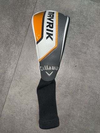 Funda para palo de golf Callaway Mavrik. - Diseñada para palos híbridos. - Número de palo: 3. - Color: Blanco, naranja y gris.