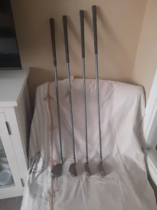 Set de palos de golf Callaway para zurdos. Talla hasta 1,60 aprox. Ideal para iniciación - Incluye 4 palos de golf: 5, SW, 9 y 7 - Varillas de color azul. - Grips negros. ¡Con un limpiado y pulido quedan como nuevos! Se venden también por separado. Si te interesa funda la tengo publicada en otro anuncio. Hago precio por pack