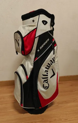 Si tienes la suerte de jugar a golf en un sitio en el que hace sol la mayor parte del año, y si además sueles usar buggy para desplazarte por el campo, te presento esta Bolsa de golf Callaway X Series en color blanco, negro y rojo. Diseñada para transportar tus palos y todos tus accesorios gracias a sus 6 bolsillos. Bolsa de 14 huecos individuales para proteger de la mejor manera los grips de los palos y con su funda impermeable para protegerlos en días de lluvia.
