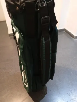 Bolsa de golf de color verde oscuro con detalles blancos. - Compartimentos para palos. - Correa ajustable para transporte. Lleva un pequeño agujero en un bolsillo delantero y un roce donde la cremallera se ve en las fotos