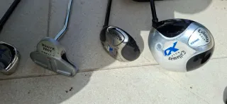 Set de palos de golf con varias marcas y modelos. ESCUCHO OFERTAS - Palo Callaway KENO. - Palo GREAT BIG BERTHA Titanium. - Palos Lynx con números 3, 5 y S. - Fundas protectoras incluidas.