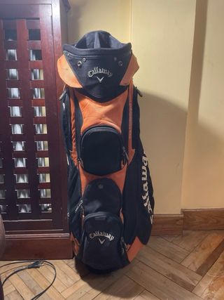 Bolsa de palos de golf de la marca Callaway, con un diseño moderno en color negro y naranja. - Compartimentos para palos. - Bolsillos con cremallera. - Correa ajustable.