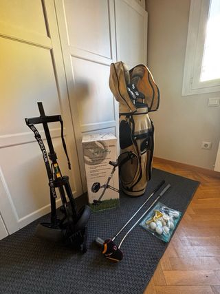 Se vende juego de palos de golf de grafito ñ usados 2 veces. Incluye Putter, P, S,5,6,7,8 y 9 de hierro y maderas 3, 5, Driver, hibridos de 21.5 y otro de 24,5, además la bolsa y un carro plegable. Los palos están en muy buen estado, algunos sin usar. Funda para las madera de regalo putter. Se venden por lesión.