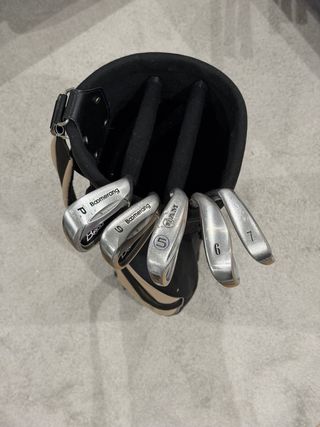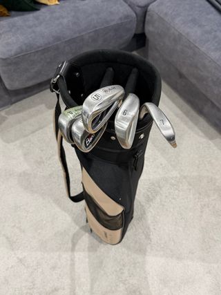 Set de palos de golf y bolsa, ideal para quienes se inician en este deporte. Incluye varios hierros y una bolsa de transporte. Todo ello en buen estado. - Hierros de diferentes números. - Bolsa de golf con 3 secciones y dos bolsillos amplios para bolas, tees, arreglapiques y otros objetos. Hierros: -5i: RAM concept 3G (Grafito Flex-R) -6i: Inesis Canaveral (Grafito Flex-R) -7i: Ozone Golf (Grafito Flex-R) -9i: Boomerang BG800 (Grafito Flex-R) -Pitching Wedge: Boomerang BG800 (Grafito Flex-R) Otro set de hierros en mi perfil.
