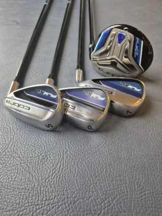 Vendo set de palos de golf Cobra Fly-XL en excelente estado. Es un equipo de alta gama ideal para jugadores que buscan perdón, ligereza y facilidad para levantar la bola. Todas las varillas son de grafito con flexibilidad Regular (R-Flex). El pack incluye: Madera 5 (19°): Incluye su funda original "5W". La corona y la cara están muy bien cuidadas. Es perfecta tanto para salidas desde el tee como para golpes largos en el fairway. Hierro 7: El palo más equilibrado para el juego medio. Pitching Wedge (P): Ideal para golpes de aproximación a green. Sand Wedge (S): Diseñado con una suela ancha para facilitar la salida del búnker.