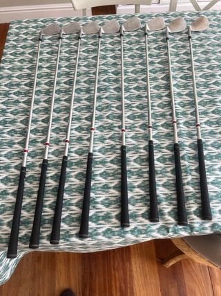 Juego de hierros Silverline para hombre diestro. Varillas de grafito flex R. Grips Tourdri Standard nuevos para estrenar. Un juego sencillo y con algunas señales de uso, pero ideal para dar los primeros pasos sin gastar mucho dinero