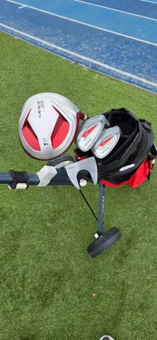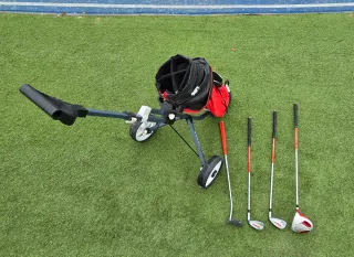 Kit completo de palos de golf para niños, incluye carro y bolsa. - Carro de golf plegable. - Bolsa de golf con compartimentos. - Incluye 4 palos de golf: driver, hierro, híbrido y putter.