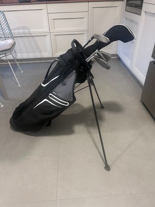 Set de palos de golf para niños de la marca US Golf, de 57', junto con un driver de la marca Inesis. Ideal para iniciarse en el golf con marerial de calidad. - Bolsa de golf con patas plegables. - Incluye varios palos y un driver. - Diseño en gris y verde.