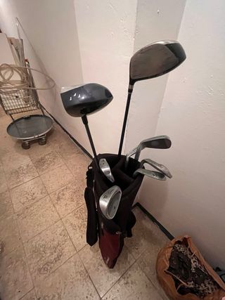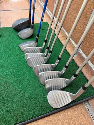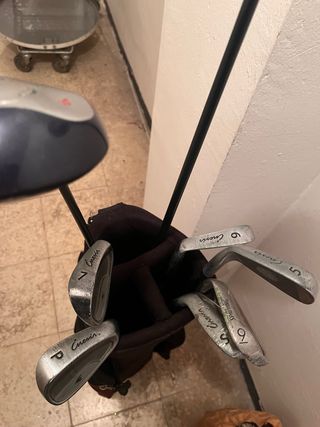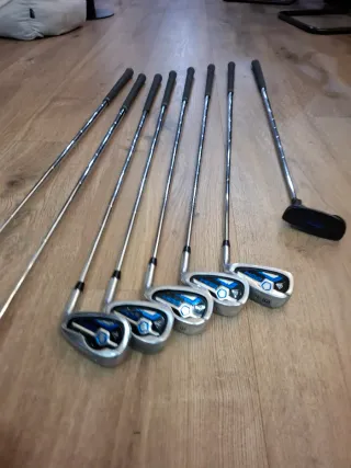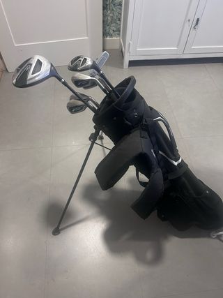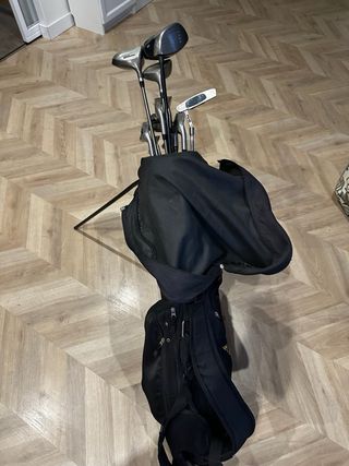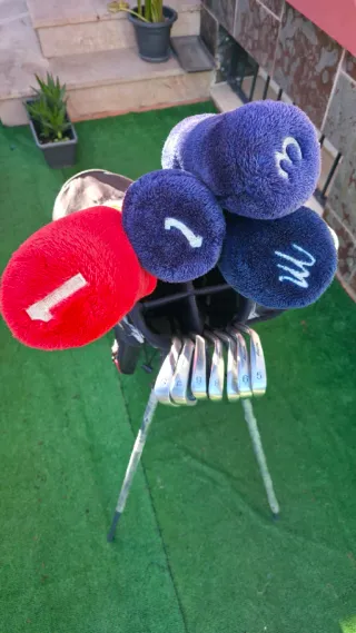 Algo negociable. Vendo bolsa de golf completa con 10 palos. Es un set híbrido ideal para iniciarse con material de alta calidad desde el primer día. Incluye marcas top (Callaway, Odyssey, Titleist) combinadas con un medio set de Wilson para hierros. Putter Odyssey White Hot XG #9 Driver Callaway FT-5 Draw (10º): Varilla Fujikura Stiff Wedge Titleist Vokey (60º) Wedge Callaway X-Tour (56º) Bolsa de Carro Callaway: Grande, robusta, con múltiples bolsillos y separadores. Cremalleras funcionando.