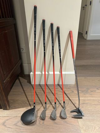 Conjunto de 5 palos de golf INESIS diseñado para niños de 8 a 10 años. Incluye un driver, varios hierros y un putter. - Driver 14º -Hierro 7/8 -Hierro 9/P -Hierro Sand Wedge - Putter ( alguno tiene marcas de uso como se ve en las fotos ) No incluye bolsa