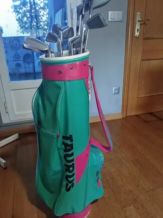 Conjunto de palos de golf Taurus casi sin usar. Incluye varios palos y una bolsa de golf. - Palos: Driver 1 (Loft 13º), Palo 5, y varios hierros. - Bolsa de golf Taurus de color verde y rosa. - Incluye un putter con la marca 34 en el mango.
