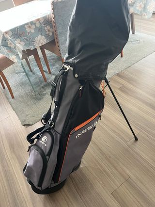 Kit de golf Inesis con 12 palos y bolsa. - Incluye driver Callaway. - Diseño en gris y negro con detalles naranjas. - Bolsa con múltiples compartimentos y funda protectora.