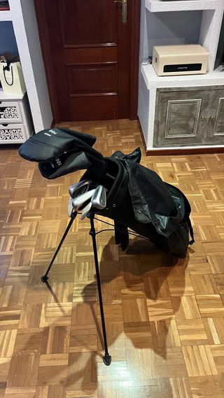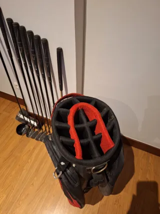 Set de golf con bolsa y palos. - Bolsa de golf negra con detalles rojos. - Incluye varios palos de golf con protectores. Driver de 170€. - Diseño moderno y funcional.