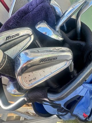 Vendo juego completo de palos de golf para mujer (diestros), ideal para iniciación. Varillas de grafito Flex L (Ladies), muy ligeras y fáciles de jugar. El conjunto incluye: Juego de 7 Hierros MIZUNO Widec: Del hierro 5 al Sand Wedge (5, 6, 7, 8, 9, P, S). Cabezas "Cavity Back" (cavidad ancha) que perdonan mucho el error. Caras y estrías en excelente estado. Set de 4 Maderas: 1 Driver MIZUNO Widec (11º) a juego con los hierros. 3 Maderas WILSON ProStaff (incluye otro Driver y maderas de calle). Incluyo las fundas de protección vintage para todas las maderas (ver fotos). Palos de buena calidad, muy cuidados y con los grips bie