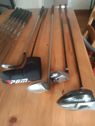 Conjunto de palos de golf para adultos, diseñados para diestros. - Incluye varios palos de diferentes tipos. - Varillas metálicas y mangos de goma. Poco uso. Ideal principiantes. Palos con mucho perdón. Marca Dunlop. Falta el Driver. Puedes comprarlo suelto conn la madera grande puedes llegar a más de 200 metros. Si estás empezando, es perfecto