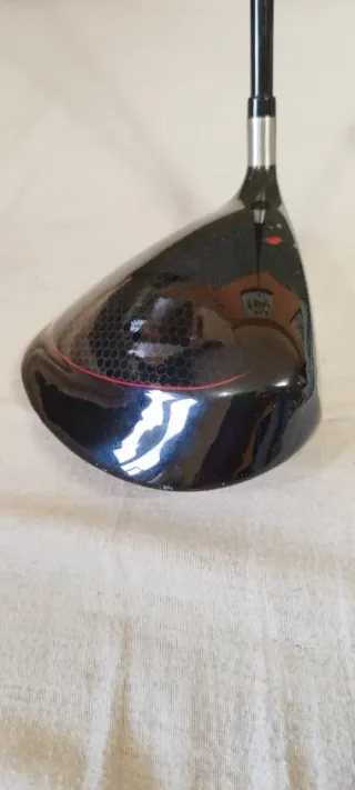 Driver de golf con acabado negro brillante y detalles en rojo. - Diseño con patrón de panal en la cabeza. - Eje de metal.