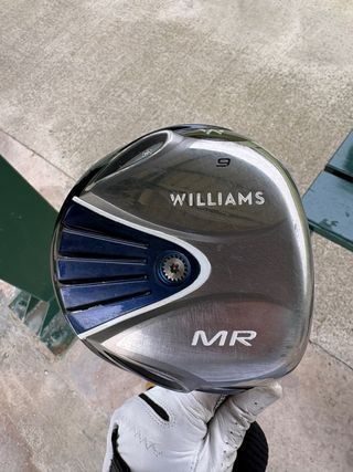 Driver de golf Williams MR con marcado de 9. - Diseño moderno en tonos grises y azules. - Detalle de tornillo ajustable en la cabeza del palo.