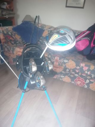 Set de bolsa y palos de golf para iniciacion. Ideal para iniciarse o para jugadores ocasionales. - Bolsa de golf azul con trípode. - Incluye varios palos de golf. - Driver, Madera 5, Hierros 5, 7, 8, 9, Pitch, Sand y Putt. - Set 9 bolas.