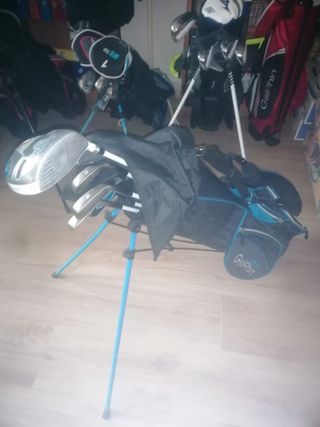 Pack completo de golf que incluye bolsa, hierros y driver. Incluye: - Bolsa. - Set de hierros Callaway Strata del P al 6. - Driver, madera 3 y 4 de la marca Mc Gregor - Incluye putter Wilson.