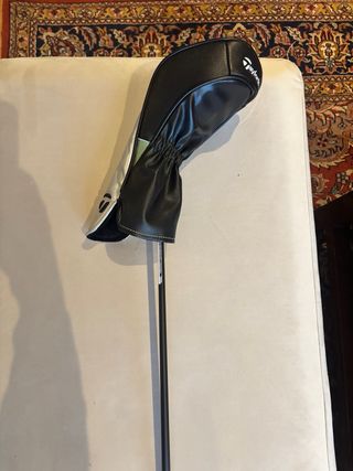 Palo de golf tipo driver de la marca TaylorMade. Incluye funda protectora. - Diseño moderno. - Funda negra y plateada.