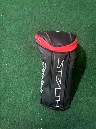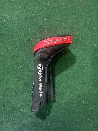 Funda para driver Taylormade Stealth. Protege tu palo de golf con estilo. - Color negro con detalles en rojo. - Diseño moderno y deportivo. - Logo de Taylormade y Stealth visibles.