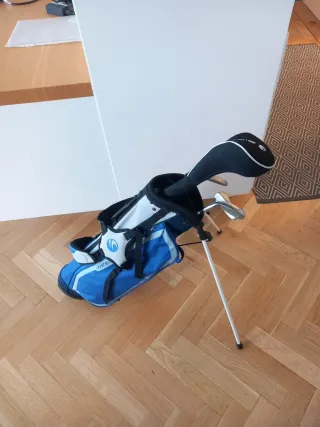 Conjunto de 5 palos de golf INESIS diseñado para niños de 8 a 10 años. Incluye un driver, varios hierros y un putter. - Driver 14º -Hierro 7/8 -Hierro 9/P -Hierro Sand Wedge - Putter ( alguno tiene marcas de uso como se ve en las fotos ) No incluye bolsa