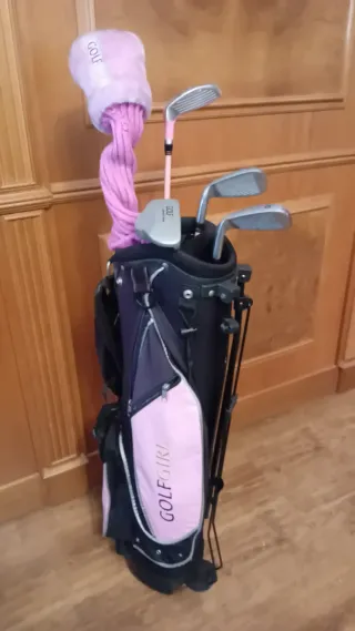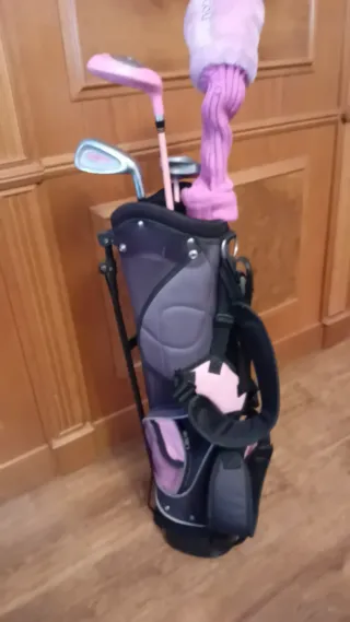 Conjunto de palos de golf para niña en tonos rosa y morado. Incluye 1 driver, 1 hibrido, 1 putt y 2 hierros, bolsa de transporte con cremalleras perfectas y capucha. La bolsa tiene tripode
