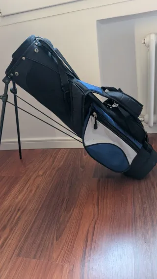 Set de palos de golf Inesis de Decathlon, en muy buen estado, ideal para iniciarse en este deporte. Incluye: i) bolsa de transporte junior, ii) palos niño 11-13 años, diestro: wedge, híbrido, putter, driver, iii) palos adulto: híbrido 100 regular, hierro 100 grafito, driver 100. Precio de compra en 2024 más del doble de lo que pido. Estoy en zona norte de Madrid (Chamartín). - Bolsa de golf azul con trípode. - Varios palos de golf con varillas azules.