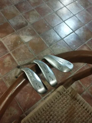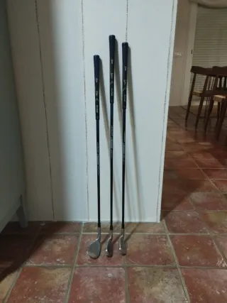 Conjunto de tres palos de golf, ideal para mejorar tu juego. Incluye: - Driver ping - Madera 7 ping - Madera 5 Cleveland. Se ve en la foto, se ha saltado un poco la pintura.